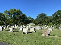 Shortly after St. Mary's Parish was founded in 1870 to serve the Catholics of Newton and Needham, Fr. Michael Dolan purchased a tract of land - "God's Thirty Acres" - in Needham to serve as a parish cemetery. Although the parish of St. Mary's was renamed "Mary Immaculate of Lourdes" at the consecration of the new church building on Thanksgiving Day, 1910, the parish cemetery retained its original name of St. Mary's. Much of the work to clear and construct the cemetery was done by hired and volunteer parishioners. During the Long Depression, Fr. Dolan employed the needy of the parish at $1 per day to build walls, construct driveways, and perform other necessary work.[30] In 1926, Fr. Dennis Donovan inaugurated the celebration of Mass at the cemetery on Memorial Day, a custom which continues to the present. The cemetery is the final resting place of several of the clergy who have served the parish of Mary Immaculate over the years, including Fr. Timothy Danahy, who built the present church, his successor Fr. Dennis Donovan, and Fr. Martin O'Brien, who was originally buried on the grounds of the old Saint Mary's Church in Chestnut Street. Within the cemetery there is a rock formation from which John Eliot is said to have preached to the Indians. St. Mary's Cemetery continues as an active cemetery to this day, serving the Catholic parishes of the greater Newton and Needham area.