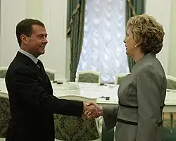 She made an official visit to Russia, with Minister of State, Billy Kelleher, for four days in September 2010, and met with President of Russia Dmitry Medvedev.[63][64] She spoke kindly of Mikhail Gorbachev, officially invited Medvedev to Ireland, and addressed students at a university in Saint Petersburg. She called for warmer relations between the European Union and Russia.[65][66][67] On her state tour to Russia, highlighting the importance of competence, she launched an unprecedented attack on the Central Bank of Ireland, for their role in the financial crisis which resulted in tens of thousands of people in mortgage arrears.[68][69]
