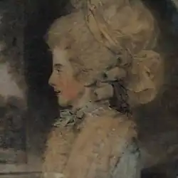 In the 1780s they were in Antigua where her husband was the Royal Commissioner.[2] one of the captains there was Horatio Nelson who hated this particular posting. The only thing in his mind that made it bearable was the presence of Mary Moutray.[2] Mary and her husband were only there for a few months in 1784 but she made a lasting impression on Nelson. He first met her in June 1784 and the friendship developed despite Nelson reporting her husband for a breach of procedure.[3] Nelson said that he cried when he first thought of Antigua without her. He said that her company was where he had "spent more happy hours than anywhere else".[2] When Nelson did start to court a wife he would tell, Frances Nisbet, about Mrs Moutray.[1] Mary wrote about Nelson noting that he took to wearing a wig because he had lost hair dues to a fever. Cuthbert Collingwood kept a sketch of him in that wig.[4]