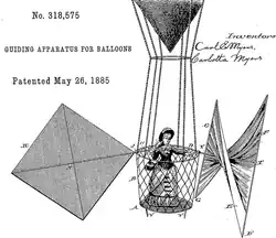 Myers assisted in the design, construction, and patenting of Carl's sky-cycles.[24] On May 26, 1885, she and Carl were granted their patent for a "Guiding Apparatus For Balloons" which consisted of a rudder and a sail attached to the side of the balloon's basket.[14]