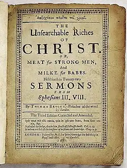 3. ^ "Ton anexichniaston plouton [sic] tou Christou. The unsearchable riches of Christ. Or, Meat for strong men. Milke [for] babes. Held for th in twenty-two sermons from Ephesians 3.8. By Thomas Brookes, preacher of the Word at Margarets New-Fishstreet". quod.lib.umich.edu. Retrieved 2023-07-27.