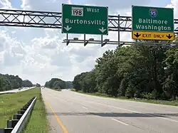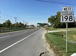 Maryland Route 198 (MD 198) is a state highway in the U.S. state of Maryland. The highway runs 14.14 miles (22.76 km) from MD 650 near Spencerville east to the entrance of Fort George G. Meade beyond its junction with MD 32. MD 198 connects Laurel in far northern Prince George's County with the northeastern Montgomery County communities of Spencerville and Burtonsville and Maryland City and Fort Meade in western Anne Arundel County. The highway is a four-to-six-lane divided highway between U.S. Route 29 (US 29) in Burtonsville and the Baltimore–Washington Parkway in Maryland City.
