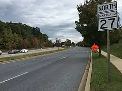 MD 27's original interchange with I-70 was constructed when US 40 was relocated as a four-lane divided highway through Ridgeville in 1953 and 1954.[24] This interchange was a four-ramp partial cloverleaf along the line of Mount Airy's Main Street directly on the Carroll– Frederick county line.[25] MD 27's bypass of Mount Airy was constructed from Dorceytown south to Ridgeville Boulevard in 1972.[30] MD 27's I-70 interchange was reconstructed to its present six-ramp partial cloverleaf design slightly to the east of the old interchange as part of I-70's upgrade to Interstate standards in 1975.[31] MD 27's bypass of Mount Airy was completed from Ridgeville Boulevard south to the I-70 interchange in 1977; MD 808 was marked on Main Street by 1978.[32][33] MD 27 was relocated at its southern end as a divided highway from MD 355 to Brink Road between 1993 and 1996.[34][35] This work was part of a state– county project to connect Ridge Road and Father Hurley Boulevard with I-270 to improve access between I-270, Germantown, and Damascus.[35] The old segment of MD 27 became Henderson Corner Road.[36]