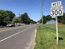 Maryland Route 300 (MD 300) is a state highway in the U.S. state of Maryland. Known for most of its length as Sudlersville Road, the highway runs 13.55 miles (21.81 km) from MD 213 in Church Hill east through Sudlersville to the Delaware state line, where the highway continues as Delaware Route 300 (DE 300). MD 300 forms part of an east–west connection between U.S. Route 301 (US 301) in northern Queen Anne's County and Dover, Delaware. MD 300 between Church Hill and Dudley Corners was one of the original state roads marked for improvement in 1909, but the county constructed the highway with state aid in the mid- to late-1910s from Church Hill to Sudlersville. The highway from Sudlersville to the state line was built in the late 1920s and early 1930s. MD 300 was widened over its entire length around 1950 and extended west to US 213's bypass of Church Hill (now MD 213) around 1970. MD 300 was officially split in two when its superstreet intersection with US 301 was built in 2005.