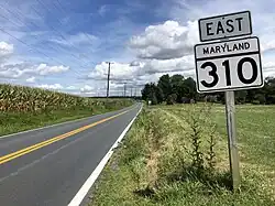 Maryland Route 310 (MD 310) is a state highway in the U.S. state of Maryland. Known as Cayots Corner Road, the highway runs 3.96 miles (6.37 km) from MD 213 at Cayots east to the Delaware state line east of St. Augustine in southern Cecil County. MD 310 was built east of St. Augustine by 1921 and west to what was then U.S. Route 213 (US 213) in the early 1940s. MD 310 was extended west when US 213 was relocated at Cayots in the early 1950s.