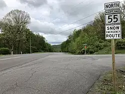 MD 55 was paved from Clarysville to Vale Summit by 1921.[5] The Vale Summit–Midland segment of the highway was constructed around 1938.[6] When US 40 was relocated in Clarysville around 1950, MD 55 was extended north a short distance to meet the new alignment.[7] MD 55 itself was rebuilt and widened from Clarysville to Vale Summit in 1952 and from there to Midland in 1954.[8] As part of MD 36's relocation between Midland and Frostburg, MD 36 took over the section of MD 55 between Midland and Vale Summit in 1972, leaving MD 55 at its present length.[9]