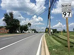 MD 97 runs through the Washington, D.C. suburbs in Montgomery County, connecting several communities including Silver Spring, Wheaton, Glenmont, Norbeck, and Olney. It continues north from there into rural areas of Howard and Carroll counties, passing through the Carroll County seat of Westminster, before reaching the Pennsylvania border.[2]
