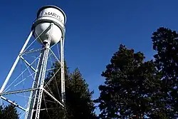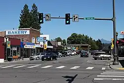 After the initial wave of suburbanization, which built homes in former strawberry fields to the north and east of Marysville, the city's population totaled 5,544 in 1980.[5] The city's growth was concentrated in outlying areas, leaving downtown to weaken economically. In 1981, the Marysville City Council declared that the downtown area was "blighted" and in need of a facelift. The council presented a $30 million urban renewal plan in November 1982 that would add new retail and office space, mixed-use development, public parks and improve pedestrian conditions in downtown, along with a large public parking lot and an expanded public marina.[27] The plan was opposed by the marina's owner and other downtown property owners and produced lengthy public hearings that lasted until the following year.[28][29] Mayor Daryl Brennick vetoed the plan in June 1983, citing public outcry and the high cost of the proposal, and the city council failed to overturn the decision.[30] The city instead developed a downtown shopping mall that involved the demolition of a water tower (one of two in the city) and several historic buildings in 1987.[31] The $17 million mall opened in August 1988 with 24 stores and 180,000 square feet (17,000 m2) of retail space.[32]