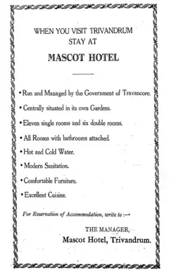 The area where the Mascot Hotel is currently situated used to be the camp of the Travancore Army. The hotel was thereafter built in the area to accommodate officers of the British Army[1] during World War I. Post war, the Travancore royal family starting using the hotel to welcome their guests.[2] Later on KTDC took over the hotel, and till now, the hotel stands as a heritage location for tourists.[3] It is the oldest star hotel of KTDC and is also considered the only heritage business hotel in Trivandrum.[4][5]