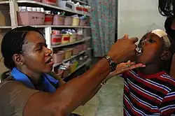 ![]() Nurse giving a deworming tablet to a child in Kakute, Uganda |