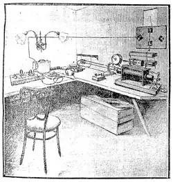 In December 1902 the American De Forest Wireless Telegraph Company set up an earlier station in an existing house on a beach near Point Judith Light and another near Block Island Southeast Light, 15 miles (24 km) from the coast.[8] By May 1903 they had successfully exchanged test messages.[9] Messages were sent using Morse code.[10] The stations were initially operated for the Providence Journal to send news stories to the island to be printed locally. Another goal was that passing ships could also send messages to the mainland which would then be relayed to Providence or New York City by telephone arriving hours before the ships reached port. At this time few places in the world were passed by so many ships as Block Island.[8] The Block Island Wireless began publishing in July.[11][12] At the time it was one of only two daily newspapers that printed dispatches sent by wireless.[a][13] The stations soon began sending messages (called "aerograms") for the public and charging a fee for the service.[14] Initially, this experimental wireless service was only intermittently successful and the Block Island Wireless ceased publication at the end of August 1903.[10][11]