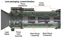 Mastcam-Z consists of two zoom cameras mounted on the remote sensing mast of the Perseverance rover. The design is an evolution of the Mastcam instrument provided for the previous Mars rover, Curiosity. They share the same detectors, electronics interface, firmware, and operations protocols. Mastcam-Z adds a 3.6:1 zoom capability, whereas the Mastcam has two fixed focal lengths. Each of the zoom cameras has a broadband red/green/blue (RGB) imaging and narrow-band visible/near-infrared (VNIR) color imaging. The sensor consists of an ON Semiconductor KAI-2020CM CCD with an array size of 1600 x 1200 pixels and can image fields of view (FOV) from ~ 5° to ~ 15°.[4][5] This is an approximately equivalent field of view to that which a 135-400mm zoom lens provides on a standard 35mm consumer camera.