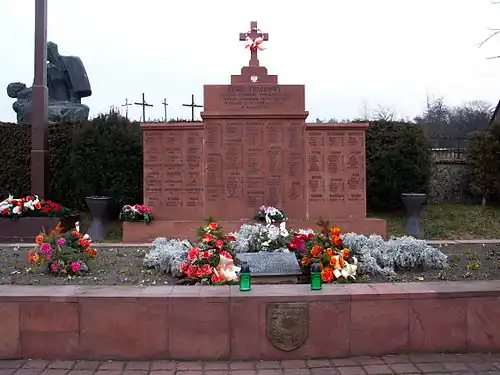 After the war, Michniów was rebuilt. Shortly after the end of the occupation, a red sandstone monument was erected on a mass grave covering the remains of the victims of pacification. It carries the names of the inhabitants of Michniów murdered in the 1943 massacre and murdered during World War II.[21]