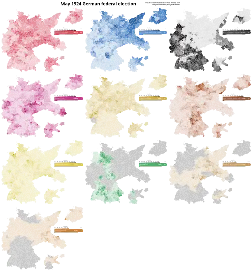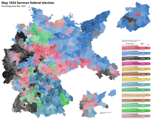 A federal election for the second Reichstag of the Weimar Republic was held in Germany on 4 May 1924.[1] It took place following a series of national crises in 1923, most notably the occupation of the Ruhr by French and Belgian troops and the resulting period of hyperinflation. The election campaign was marked by strong ideological differences over how the government had handled the problems. In the voting, the parties of the far left and far right made significant gains at the expense of the moderate parties that had been in the government or had supported it.