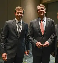 Buttigieg served for seven months in Afghanistan as a lieutenant in the U.S. Navy Reserve, returning to the United States on September 23, 2014.[55] While deployed, he was assigned to the Afghan Threat Finance Cell, a counterterrorism unit that targeted Taliban insurgency financing.[56][57] In his absence, Deputy Mayor Mark Neal, South Bend's city comptroller, served as executive from February 2014 until Buttigieg returned to his role as mayor in October 2014.[2][55][58]