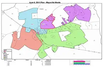 Maysville is apportioned into four voting wards. Members from the city's council[16] are elected into representing each assigned ward during council meetings.