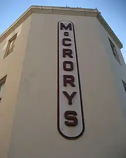 The retailer John McCrorey opened his first McCrory store in Scottdale, Pennsylvania, in 1882.[1] By 1885, the J. G. McCrory Company had five stores in Pennsylvania. McCrorey dropped the e from his last name to avoid paying for extra letters on his store signs.[1] One of his policies was to only pay a reasonable price for store locations.