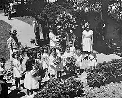 White students presenting flowers at the McDonogh monument on McDonogh Day in the 1930s