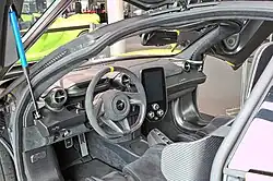 The interior consists largely of exposed carbon fibre and Alcantara, with seats that can be upholstered in Alcantara or leather, depending on the customer's preference.[9] Behind the two seats is room large enough for two helmets and race suits, reflecting the car's minimalist and track focused design. The car utilises McLaren's hydraulic RaceActive Chassis Control II (RCC II) suspension along with double-wishbone control arms.[9][15]