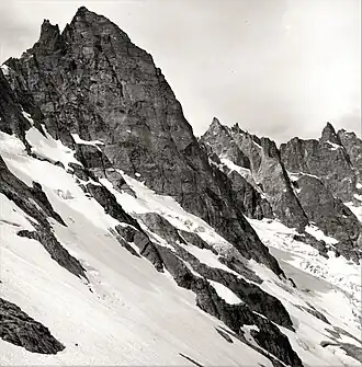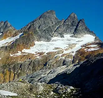 McMillan Spire (8,004 feet (2,440 m)) is a mountain peak in the Picket Range in the U.S. state of Washington and within North Cascades National Park.[3] The peak lies .75 mi (1.21 km) east of Mount Degenhardt, and 0.47 mi (0.76 km) east of Inspiration Peak. The subpeak known as East McMillan Spire (7,992 ft (2,436 m)) is .14 mi (0.23 km) east of McMillan Spire and they are collectively referred to as the McMillan Spires. The Terror Glacier lies to the west of the peak.