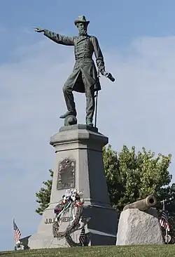 The bronze statue of General James B. McPherson sitting atop a hill near the cemetery entrance.