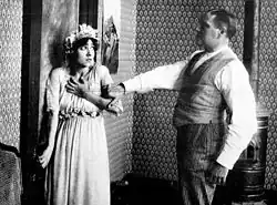 A catastrophe strikes when McTeague is debarred from practicing dentistry by the authorities. It becomes clear that Marcus has taken revenge on Mac before leaving by informing City Hall that he has no license or academic degree. McTeague loses his practice, and the couple is forced to move into successively poorer quarters as Trina becomes more and more miserly. Their life together deteriorates, with McTeague escalating in his abuse until he steals all of Trina's domestic savings of $400 (roughly $15,000 in 2024 values) and abandons her. Meanwhile, Trina falls entirely under the spell of money and withdraws the principal of her prior winnings in gold from her uncle's firm so she can admire and handle the coins in her room, at one point spreading them over her bed and rolling around in them.