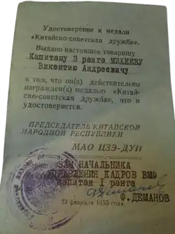 - ^ "Медаль "Китайско-Советская дружба"". kommynist.ru. Retrieved 2021-04-30.