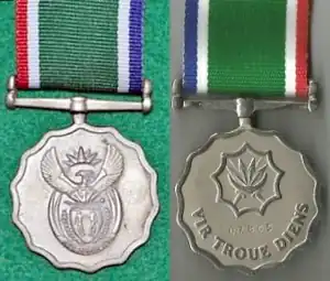 Upon completion of further periods of ten years of qualifying service, the Medalje vir Troue Diens - Medal for Loyal Service and the appropriate bar may be awarded in addition to previous medals for long service which had been awarded for service in these former forces.[1]