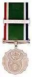 The reverse bears the emblem of the South African National Defence Force at the top and is inscribed, in relief, with the words "VIR TROUE DIENS" around the lower perimeter, with the medal number impressed between the emblem and the inscription. The medal is attached to a plain nickel-silver suspender affixed to the upper rim of the medal.[1][9]