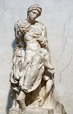 The Medici Madonna is a marble sculpture carved by the Italian Renaissance master Michelangelo Buonarroti measuring about 88.98 inches (226 cm) in height. Dating from 1521 to 1534, the sculpture is a piece of the altar decoration of the Sagrestia Nuova in the Basilica of San Lorenzo, Florence.[1]