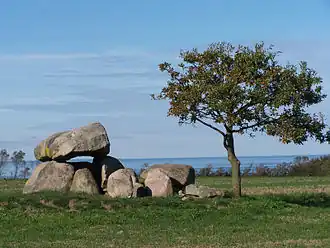 Megaliths in Mecklenburg-Vorpommern are the subject of an abundance of lore, dealing primarily with giants, fairies, dwarfs, subterraneans and hidden treasures.[19] The giant tales relate primarily to the megaliths' creation, which was assumed to be the result of stones lost or thrown by giants, or of giants building houses, ovens or tombs.[19] Thus, the population refers to dolmens as Hünengräber ("giants' tombs", Sg. Hünengrab).[19][20]