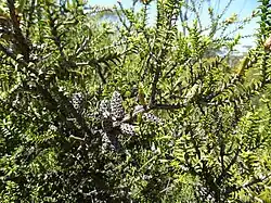 The flowers are white to cream coloured and arranged in spikes on the sides of the branches. Each spike is up to 15 mm (0.6 in) in diameter and contains 8 to 50 individual flowers. The petals are 1.7–2.1 mm (0.07–0.08 in) long and usually fall of as the flower opens. The stamens are arranged in five bundles around the flowers and there are 10 to 16 stamens in a bundle. Flowering occurs between July and January and is followed by fruit which are woody capsules 2–3.3 mm (0.08–0.1 in) long in roughly cylindrical clusters along the stems.[2][3]