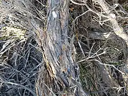 Melaleuca araucarioides is a small to medium tree, about 0.5–1.5 m (2–5 ft) high and wide with rough bark. Its leaves are fleshy and glabrous, about 2–6 mm (0.08–0.2 in) long and 1–2 mm (0.04–0.08 in) wide. They are crowded and arranged in groups of three forming six rows of leaves along the branches.[2][3][4]