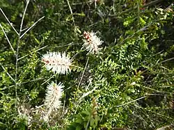 The flowers are arranged in spikes, usually on the ends of branches which continue to grow after flowering. Each spike has between 6 and 55 individual flowers and is up to 30 mm (1 in) long and 15 mm (0.6 in) wide, white, creamy white or yellow. The petals are 0.7–2.0 mm (0.03–0.08 in) long and fall off as the flower ages. The stamens are arranged in five bundles around the flower, each bundle containing between 3 and 11 stamens. Flowering occurs in spring and is followed by fruit which are woody capsules 1.5–4 mm (0.06–0.2 in) long in cylinder-shaped clusters up to 30 mm (1 in) long.[4][5]