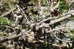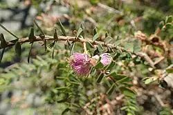 The flowers are a shade of pink or purple and are arranged in short spikes which develop from the sides of the branches. The spikes contain 2 to 4 individual flowers and are up to 16 millimetres (0.6 in) in diameter. The petals are 3–4 millimetres (0.1–0.2 in) long, folded downwards and fall off as the flower matures. The stamens are arranged in five bundles around the flower, each bundle containing 25 to 36 stamens. Flowering mostly occurs in spring and early summer and is followed by the fruits which are woody capsules 4–6 millimetres (0.2–0.2 in) long, about 8 millimetres (0.3 in) in diameter and fused with the branches.[2][3]