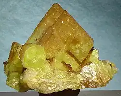 Melanophlogite (MEP) is a rare silicate mineral and a polymorph of silica (SiO2). It has a zeolite-like porous structure which results in relatively low and not well-defined values of its density and refractive index. Melanophlogite often overgrows crystals of sulfur or calcite and typically contains a few percent of organic and sulfur compounds. Darkening of organics in melanophlogite upon heating is a possible origin of its name, which comes from the Greek for "black" and "to be burned".[2][4]