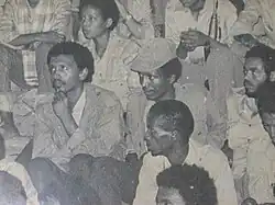 Meles (far right) sitting next to Bereket Simon in a 1970s political meeting