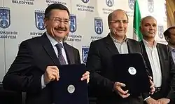 Gökçek with Mayor of Tehran, Mohammad Bagher Ghalibaf signing a sister city contract