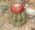 Melocactus bellavistensis has glossy, dark green, depressed, spherical to slightly elongated, conical shoots measuring 6–25 cm in height and 8–25 cm in diameter. It features 9–18 sharp-edged ribs separated by straight grooves, with areoles sunken into the ribs' notches. The spines are whitish to reddish-yellow with a gray tint, curved downward, and vary in strength. Central spines, if present, are 0.1–1.7 cm long; radial spines number 6–12, up to 2.5 cm long, with the longest at the bottom. The cephalium, consisting of creamy-white wool and reddish bristles, grows up to 15 cm tall and 6–10 cm wide. Flowers are deep pink, 1.8–2.6 cm long, and 0.5–1 cm in diameter. Fruits are red, 1.5–2.9 cm long.[3]