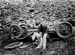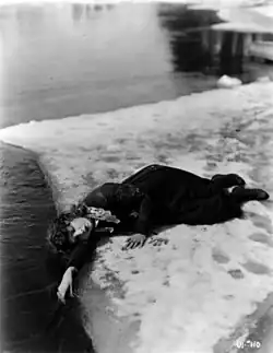 A still from the film serial The Perils of Pauline (1914). According to film scholar Ben Singer, melodrama is a "cluster concept", encompassing not only the standard Hollywood studio-era model but also the action-oriented "sensational melodramas" of the silent era.[29]