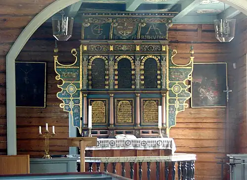 The new building was a wooden long church with a choir on the east end of the nave. The new church was consecrated on 24 October 1728. In 1737, Alstrup sold the church to Captain Christian von Barnholdt. In 1767, a tower was built on the church. In 1828, the Løvenskiold family purchased the church. In 1840, the old tower was removed and a new, larger tower was built on the west end of the nave. A church porch is located beneath the tower and that is used as the main entrance to the church. In 1854, the local municipality took ownership of the church which had been privately owned since 1723. In 1883, the pews were changed, and the church got new windows and a new baptismal sacristy. In 1897, the interior walls were paneled to cover up the log construction and the ceiling was changed. In 1970–1976 the interior was restored and the wall paneling was removed.[4]