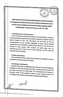 Argentina and Iran signed a memorandum of understanding in 2013 for a joint investigation of the AMIA terrorist attack. The full name was Memorandum of understanding between the Government of Argentina and the Government of Islamic Republic of Iran on the issues related to the terrorist attack against AMIA headquarter in Buenos Aires on 18 July 1994. One of the proponents for the memorandum, former president Cristina Kirchner described it as "a historical event" and considered that the agreement would serve to advance the investigation of the AMIA attack.