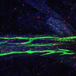 In transgenic mice containing Prox1-GFP or Vegfr3-LacZ reporter genes, the lymphatic vessels may be visualized by fluorescent microscopy or after X-gal staining, respectively.[2]
