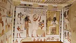 Two more women, Way and Nefery are depicted in Menna's tomb. They both carry the titles of "Chantress of Amun" and "Lady of the House". They are also labelled with the word "sA.t" which can mean 'daughter' but can also mean 'daughter-in-law'. Their title of "Lady of the House" indicates that they were married, so they may well have been the wives of Se and Kha.[8]
