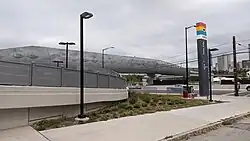 A pedestrian bridge was planned but not originally opened when the stadium first opened. The bridge was completed in January 2019 at a cost of ~$33 million.[67] It features a serpentine like structure on both ends, and a cover over the main span with customizable LEDs. The bridge connects gameday parking lots and the Vine City MARTA Station to the northwest side of the stadium and The Home Depot Backyard, allowing pedestrians to avoid crossing the busy, 6 lane Northside Drive.