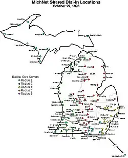 In 1994 the Merit Board endorsed a plan to expand the MichNet shared dial-in service, leading to a rapid expansion of the Internet dial-in service over the next several years.[17][18] In 1994 there were 38 shared dial-in sites.[9] By 1996 there were 131 shared dial-in sites and more than 92% of Michigan residents could reach the Internet with a local phone call.[9] And by the end of 2001 there were 10,733 MichNet shared dial-in lines in over 200 Michigan cities plus New York City, Washington, D.C., and Windsor, Ontario, Canada.[9] As an outgrowth of this work, in 1997, Merit created the Authentication, Authorization, and Accounting (AAA) Consortium.[19]