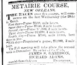 The Spring Meeting of The Metairie Jockey Club for 1839 over the Metairie Course commenced on Tuesday, March 26, and lasted for six days. The First Day of racing Sweepstakes for 3-year olds, 2 Mile Heats, Entrance Fee $1,000, Forfeit Fee $250, Nine Subscribers: Montfort Wells' Beeswing, C.C.S. Farrar, D. Stephenson's Dublin, H.A. Tayloe, Minor Kenner's Greydoc, Ira Smith's Maria, James S. Garrison's Altorf, William R. Barrow's Picayune, James Shy's Curculia. Same Day, A match between the noted trotting horses Bird and Confidence, 2-mile heats in harnesses for $6,000. Second Day, Wednesday, March 27, Jockey Club Purse $800, 2 Mile Heats. Same Day Sweepstakes for Gentlemen Riders, 2 Mile Heats, Entrance Fee $50, the proprietors to add a silver cup, value $300. Third Day, Jockey Club Purse $1,200, 3 Mile Heats. Fourth Day, Jockey Club Purse $2,000, 4 Mile Heats. Fifth Day, Jockey Club Purse $600, Mile Heats, best 3 in 5. Same Day, Sweepstakes for 2 Year Olds, Mile Heats, Entrance Fee $500, Forfeit Fee $150, seven subscribers:Montfort Wells, A.L. Bingaman, C.C.S. Farrar, W.J. Minor, Minor Kenner, W.R. Barrow, James Shy. Sixth Day, Proprietors Purse, $1,000, 3 Mile Heats. Same Day, Match between the celebrated trotting hosrse Pompeii and Rolla, best 3 in 5, in harness for $1,000. P. CENAS Secretary.[5]