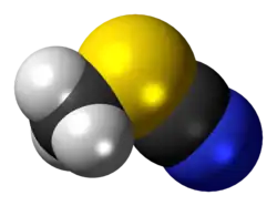 Methyl thiocyanate is an organic compound with the formula CH3SCN. The simplest member of the organic thiocyanates, it is a colourless liquid with an onion-like odor. It is produced by the methylation of thiocyanate salts. The compound is a precursor to the more useful isomer methyl isothiocyanate (CH3NCS).[4]