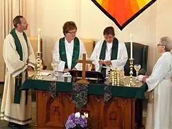MCC bases its theology on the historic creeds of the Christian Church, such as Apostles' and Nicene creeds. Every church is required to celebrate the Eucharist at least once a week, and to practice open communion, meaning that recipients need not be a member of the MCC or any other church to receive the Eucharist. Beyond that MCC allows its member churches independence in doctrine, practice, and worship as worship styles vary from church to church. The MCC is considered to be Bible-based[10] and many pastors take a fundamentalist approach to scripture.[11]
