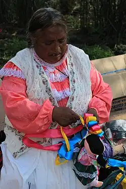 However, the making of the dolls is not limited to Amealco. Because of their popularity, their manufacture either by handcrafting or more industrial methods expanded to other parts of Queretaro, into Guanajuato (especially among Otomi populations there) and then into other states.[6] This expansion has led to variations in the doll's dress and sometimes appearance, such as skin tone.[6][5]